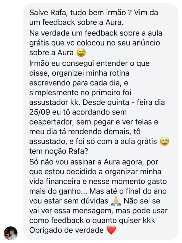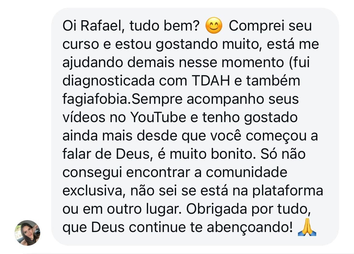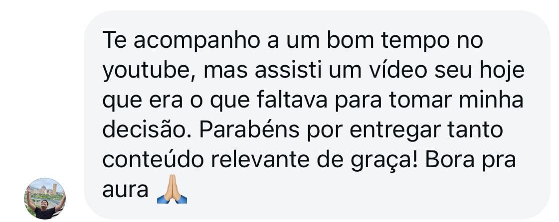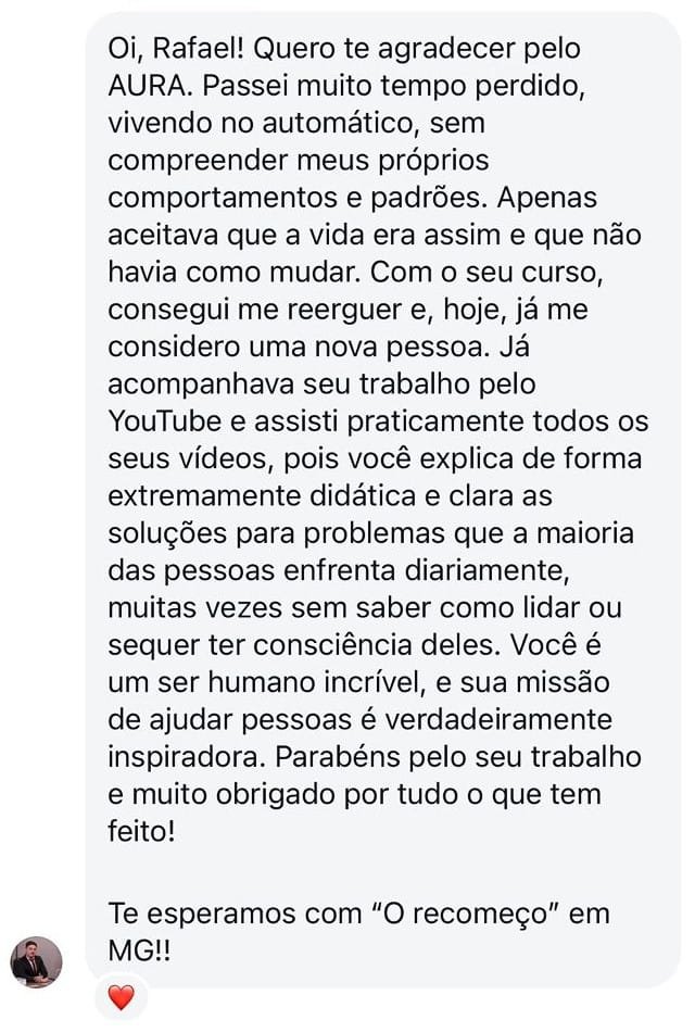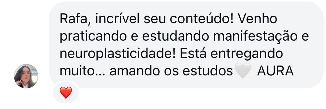 Eu tava buscando o meu propósito. E os vídeos do Rafa sempre me chamaram atenção por isso. Qual caminho a seguir? Então, o protocolo eu encontrei principalmente na prática do exercício da gratidão consciente e constante. Foi excepcional pra mim. Não só com a prática da gratidão, mas entender o meu funcionamento, o meu cérebro, entender as emoções, entender toda a questão biológica, fisiológica, me ajudou a me conhecer.